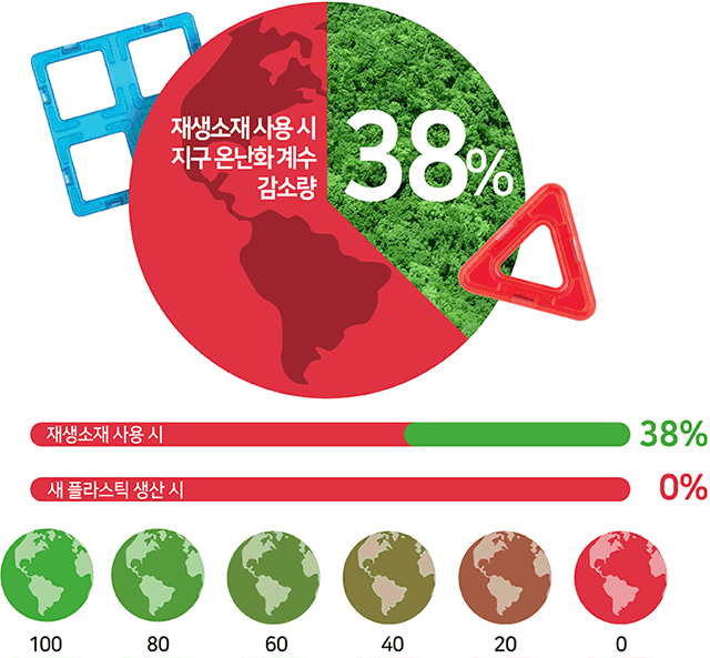 맥포머스 자석피스에는 일반 플라스틱에 비해 충격이나 열에 강한 합성수지인 ABS를 적용하고 있는데, 앞으로 이를 폐 플라스틱을 재활용해 만든 재생소재로 변경 적용을 해주면 폐 플라스틱 활용도를 높이고 탄소 배출양도 줄여 환경 보호에 기여하게 된다고 할 수 있습니다.